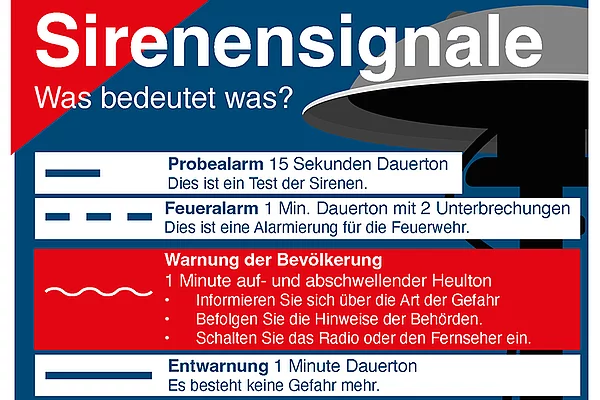 Der einminütige auf- und abschwellende Dauerton dient zur Warnung der Bevölkerung. Der Ton fordert auf, Radio oder Fernsehen einzuschalten oder sich anderweitig über drohende Gefahren zu informieren. - Entwarnung
