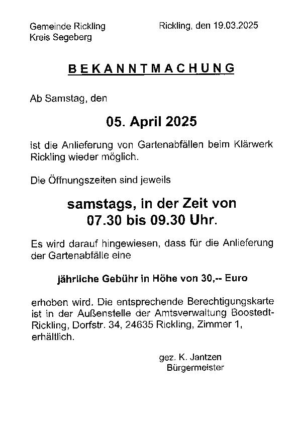 Das Jahresentgelt für die Nutzung des Kompostplatzes auf der Kläranlage beträgt ab dem 01.01.2025 30,- Euro.