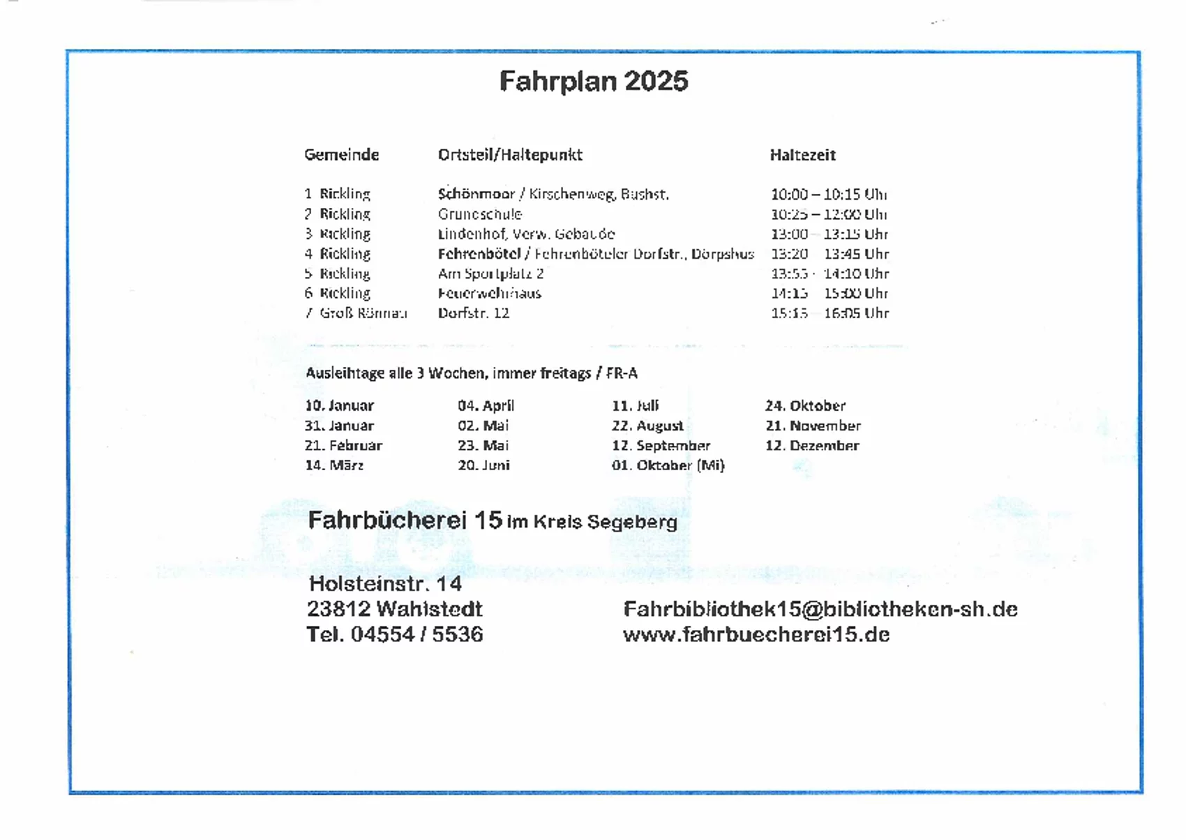 Hier finden Sie alle wichtigen Informationen und den Kontakt der diesjährigen Fahrbücherei.