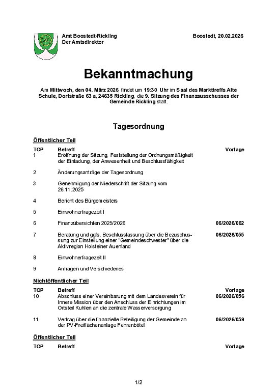 Amtliche Bekanntmachung über die Sitzung des Finanzausschusses am 04.03.2026 - Bereitstellungstag: 20.02.2026